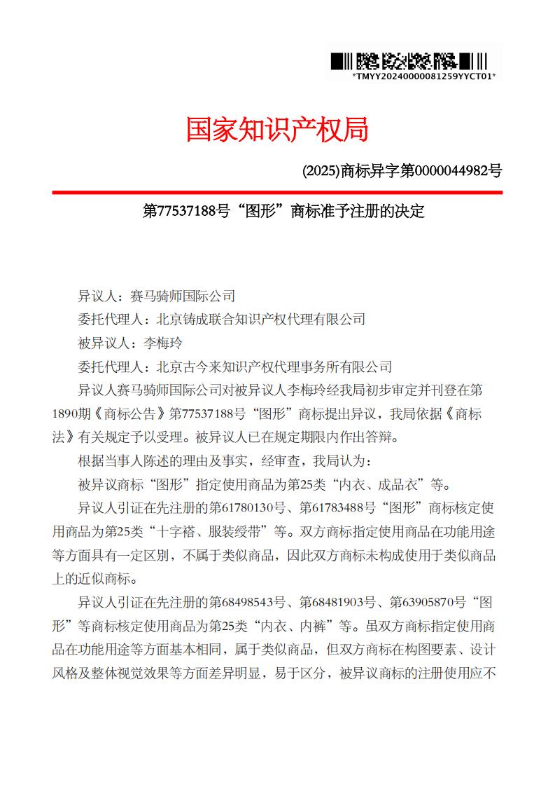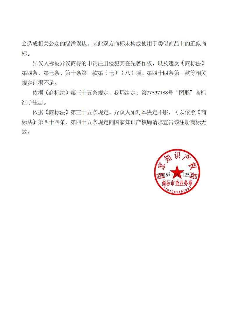 我司代理李梅玲异议案取得胜诉,被异议的第77537188号“图形”商标准予注册。