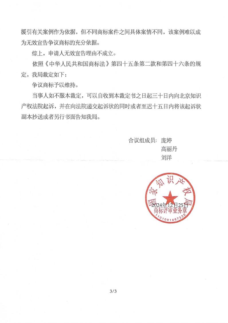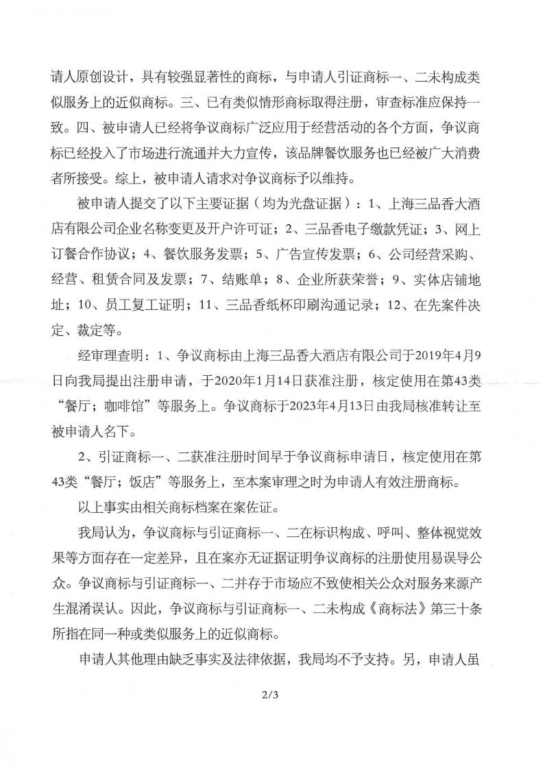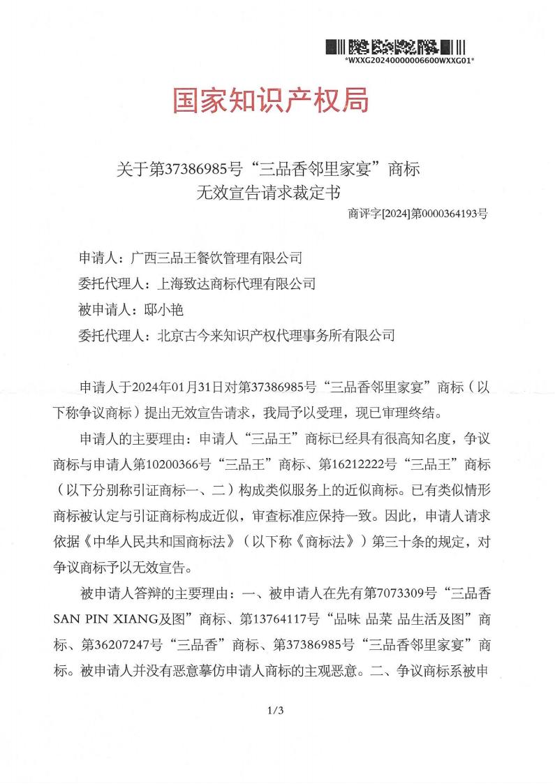 我司代理邸小艳商标无效宣告案取得胜诉,第37386985号“三品香邻里家宴”商标予以维持。
