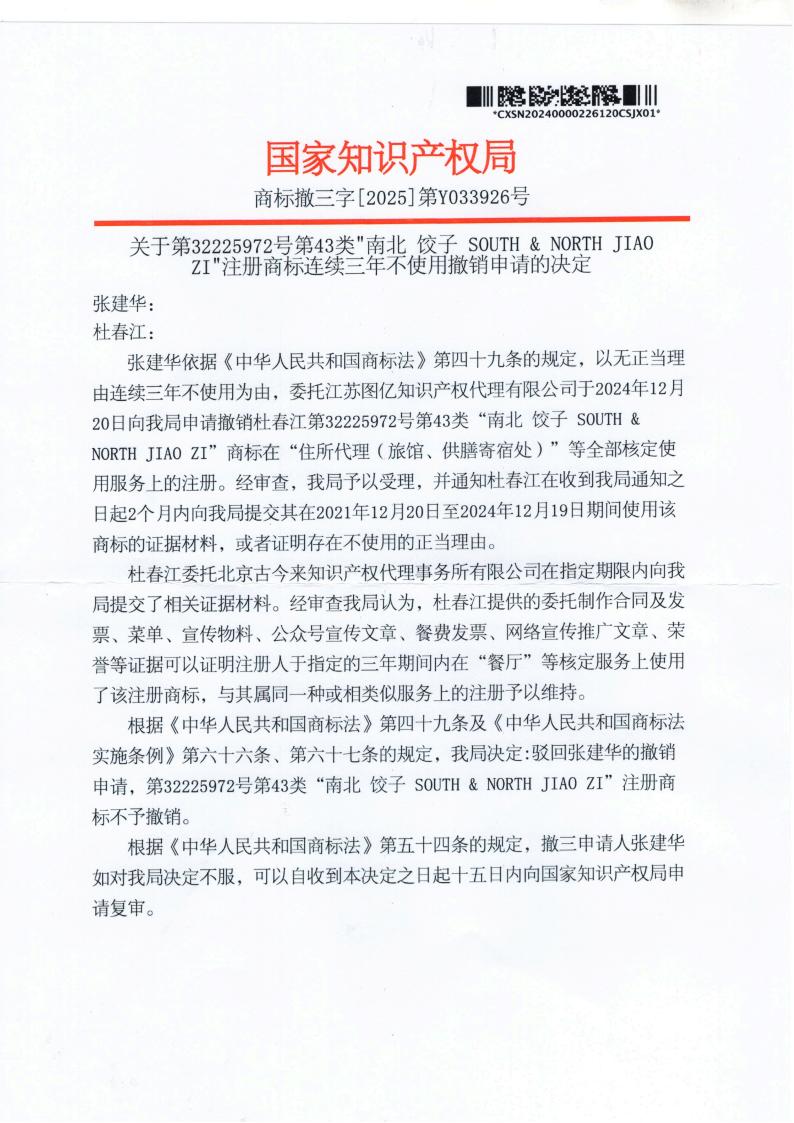 我司代理第32225972号 “南北 饺子” 商标撤三申请,成功帮客户保住商标。